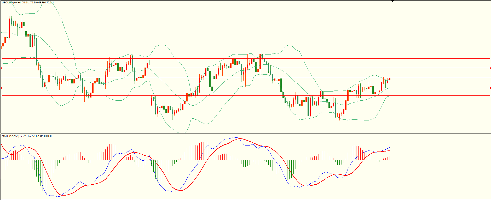 原油昨日小幅回调后展开反弹,至收盘续创日内新高,日线报收上下影线中阳线,目前上方临近前密集压力区,收复后本轮反弹方可继续,从4H来看,布林中轨偏上,MACD零轴上方运行,日内下方首要支撑69.30-40,第二支撑68.70,上方阻力71.00,71.80-90,保持在第一支撑上方短线有望测试第一阻力。