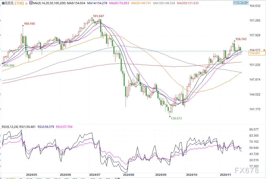 北京时间11月22日10:04,美元兑日元报154.46/47