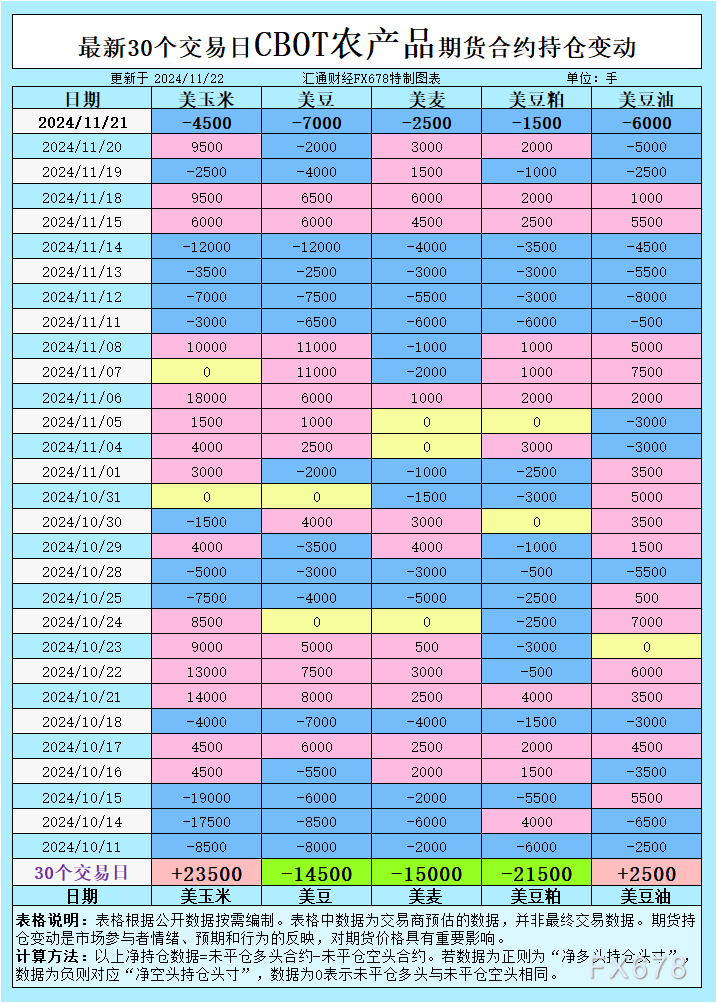 周五(11月22日),CBOT谷物期货市场呈现全线下跌的态势。随着全球贸易动态、气候条件的变化,以及资金流向的影响,主要农产品期货合约的持仓分布与基差波动成为市场 核心焦点。尽管一些商品基金在短期内增持了部分品种的多头头寸,但净空头压力依然主导,市场情绪趋于谨慎。