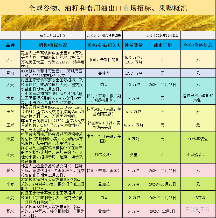 全球谷物、油籽和食用油出口市场招标、采购概况: