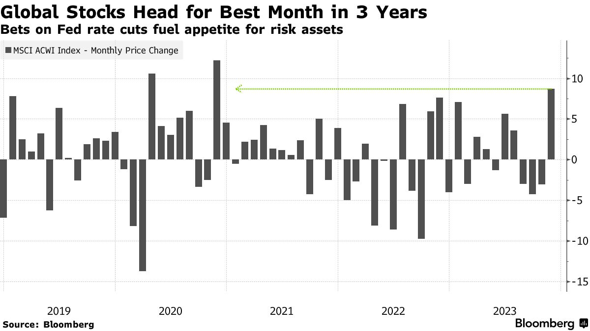 通胀缓和以及美国经济放缓迹象低于预期,使美国国债、机构债和抵押贷款债务创下 20 世纪 80 年代以来最好的月份水平,引发 11 月的反弹,将资产从股市拉向新兴市场的信贷。