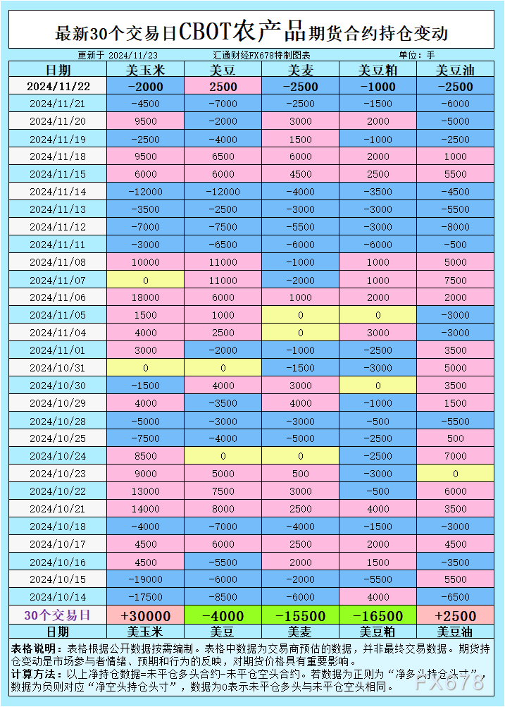 3. 基金持仓变化:截至11月22日,大宗商品基金大幅增加了小麦的净空头头寸,但最近五个交易日转为净多头。基金对短期市场走势预期发生波动,或反映出对全球供应与需求前景的不确定性。