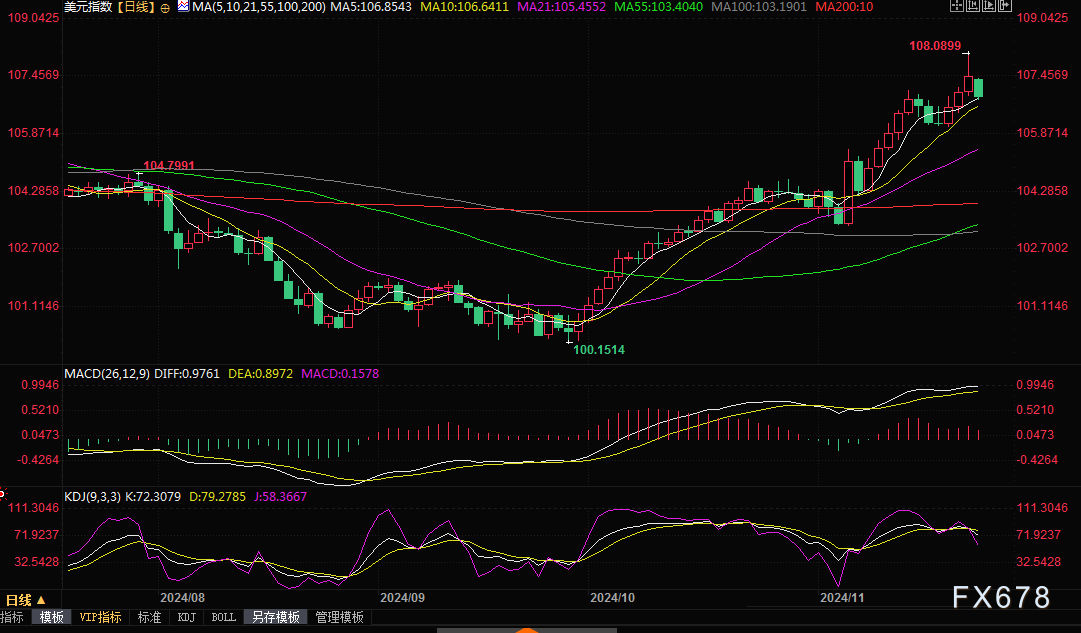 因为市场对美联储12月降息预期持续降温,美元指数上周五曾触及两年高点 108.09。