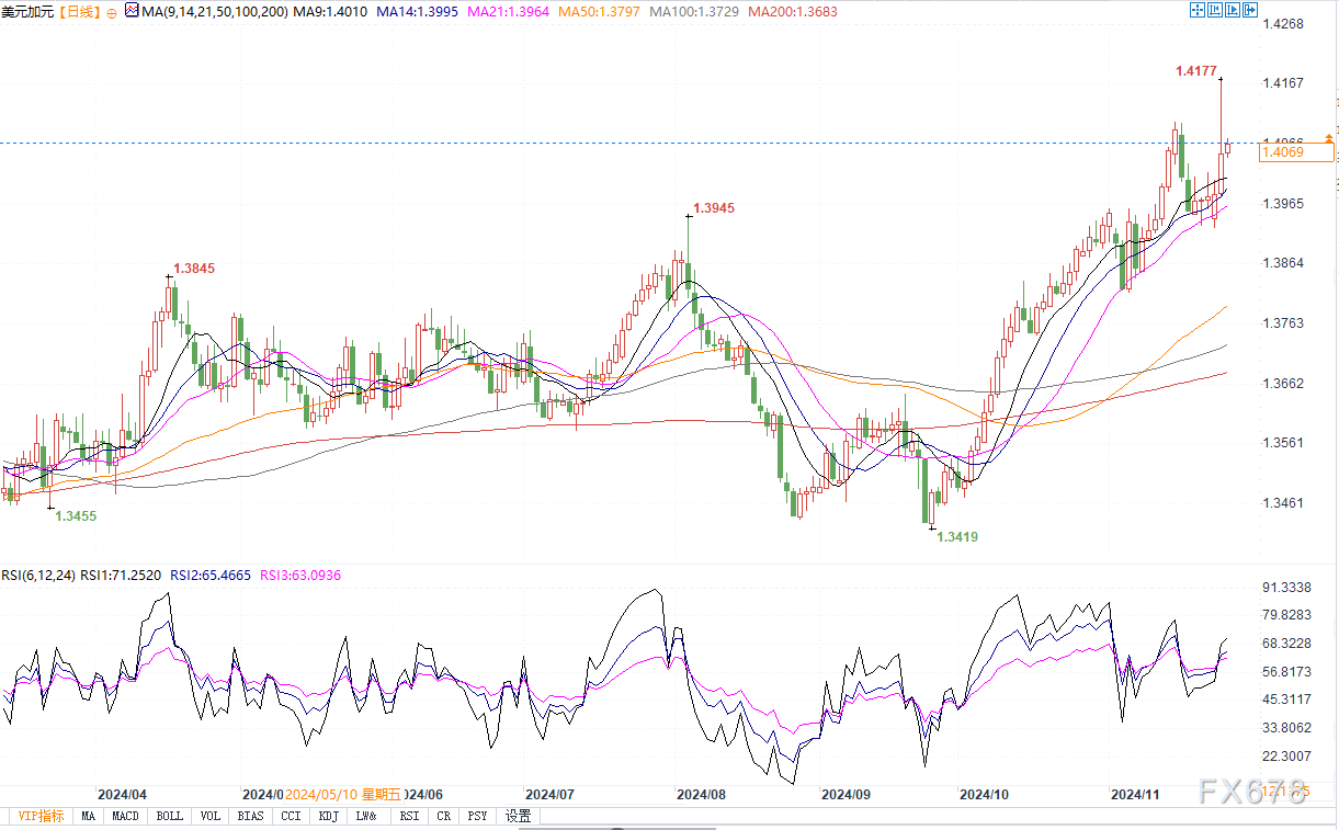 北京时间11月27日14:34,美元兑加元报1.4067/69