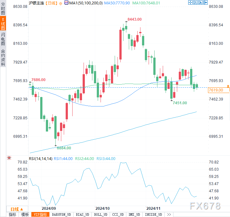短期来看,沪银价格或继续受到美元走势和宏观经济指标的双重影响。技术面上需关注下方支撑位7500-7600元/吨,上方压力位7800元/吨。未来趋势的判断需要密切跟踪国际市场资金流向及美元指数的变化。