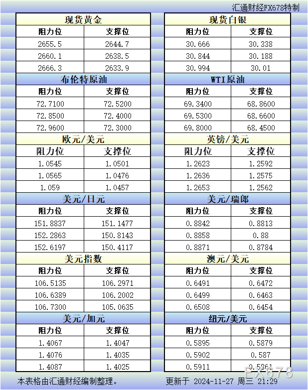 11月27日美市更新的黄金、白银、原油、美元指数、欧元、英镑、日元、瑞郎、澳元、加元、纽元支撑阻力位一览。