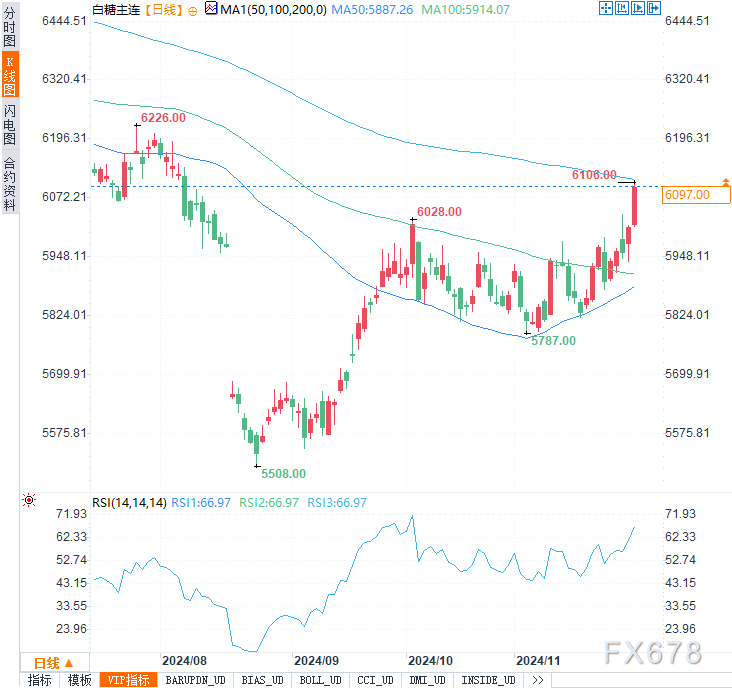 技术面显示,郑糖主力2501合约增仓上行,突破关键阻力位并刷新年内新高。虽然短期存在回调风险,但5900元/吨支撑较强,上方压力集中在6250元/吨附近。综合来看,政策预期叠加短期需求释放,可能为白糖价格提供支撑,但中长期走势仍需关注全球供需平衡的变化。