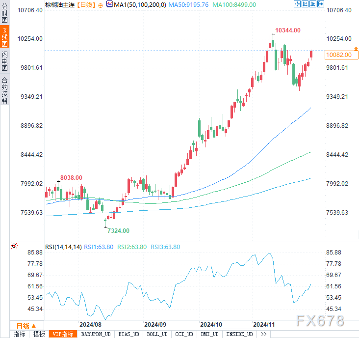 棕榈油市场受多方因素共同推动。马来西亚棕榈油产量下降及令吉走软对价格形成直接支撑,而国际油价维持强势也带动整体油脂市场的情绪上扬。不过,马来西亚出口数据显示,11月上旬棕榈油出口量环比减少8.2%-9.2%,需求端压力不容忽视。此外,北半球冬季的到来可能进一步削弱棕榈油的消费需求。