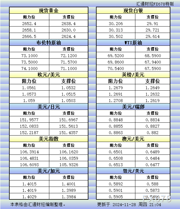11月28日美市更新的黄金、白银、原油、美元指数、欧元、英镑、日元、瑞郎、澳元、加元、纽元支撑阻力位一览。