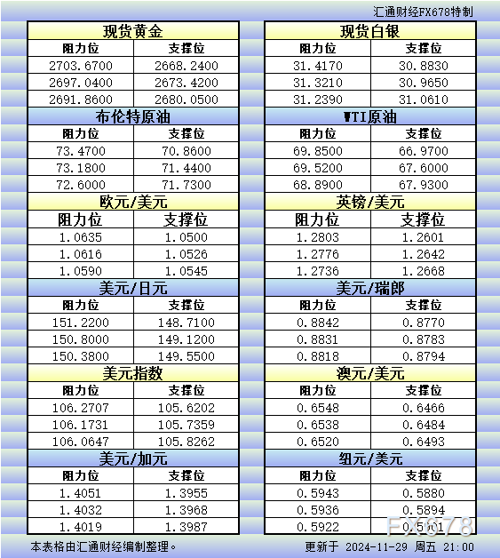 11月29日美市更新的黄金、白银、原油、美元指数、欧元、英镑、日元、瑞郎、澳元、加元、纽元支撑阻力位一览。