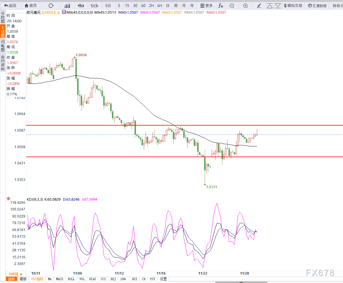 周五(11月29日)欧元兑美元欧盘交投于1.0560附近,基本面上美元指数大幅调整,但尚未跌破区间支撑。
