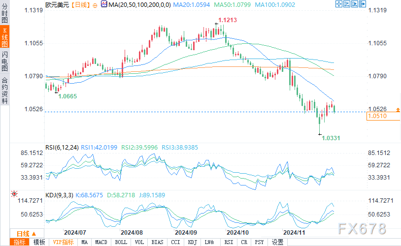 欧元/美元继续在11月低点1.0333上方窄幅横盘,同时保持在11月20日高点1.061下方。虽然触顶,但中期下行趋势仍未改变。