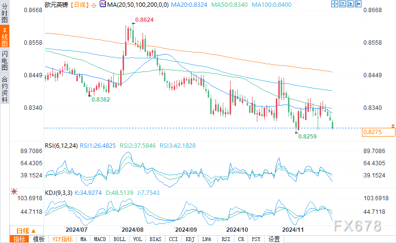 欧元/英镑跌向11月22日的低点0.8269。在其下方是11月的低点0.826,这是2022年4月的水平。