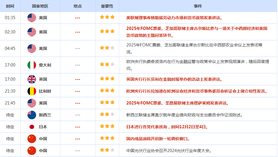 美元指数周二基本持平,当日微跌至106.33。美国劳工部统计局称,截至10月最后一天,衡量劳动力需求的职位空缺增加了37.2万个,至774.4万个,美元随后缩减了跌幅。根据伦敦证券交易所集团(LSEG)计算,美国联邦基金利率期货价格显示,本月降息25个基点的可能性为 70%,暂停降息几率为 30%,与周一晚间相比变化不大。美联储官员们周二表示,他们仍然认为通胀率正在向2%的目标回落,并表示支持未来进一步降息。