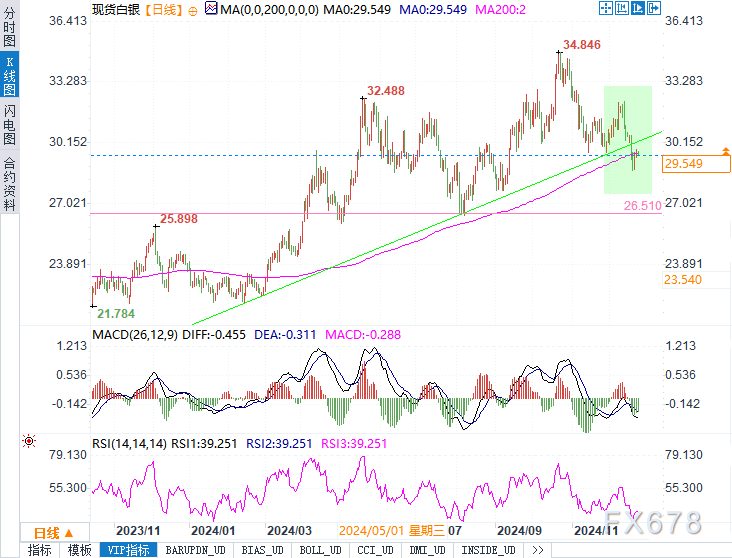 在未来的几周内,白银价格的走势可能将继续受到美联储货币政策预期、美元强势以及全球经济不确定性的共同影响。随着年底临近,市场流动性较低,交易量也受到假期影响,可能会导致价格波动更加剧烈。然而,若美联储继续保持其相对鹰派的货币政策立场,且美国国债收益率继续上升,则白银的上行空间可能将受到压制。