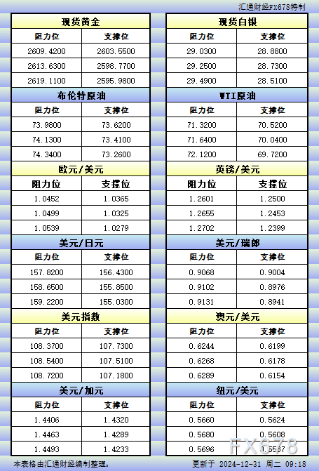 12月31日亚市更新的黄金、白银、原油、美元指数、欧元、英镑、日元、瑞郎、澳元、加元、纽元支撑阻力位一览。