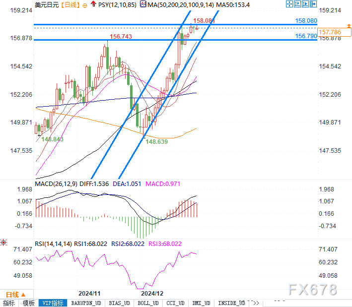 短期来看,美元/日元的支撑位于9日均线附近,即156.79,紧随其后的是上升通道的下沿支撑位156.50。如果跌破这一支撑区域,可能会打开进一步回调的空间。