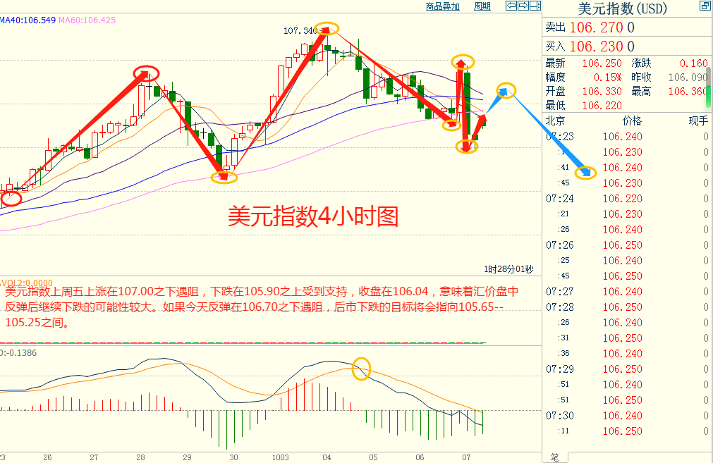 美指上周五上涨在107.00之下遇阻,下跌在105.90之上受到支持,意味着美元短线上涨后有可能保持下跌的走势。如果美指今天上涨在106.70之下遇阻,后市下跌的目标将会指向105.65--105.25之间。今天美指短线阻力在106.65--106.70,短线重要阻力在107.30--107.35。今天美指短线支持在105.65--105.70,短线重要支持在105.25--105.30。
