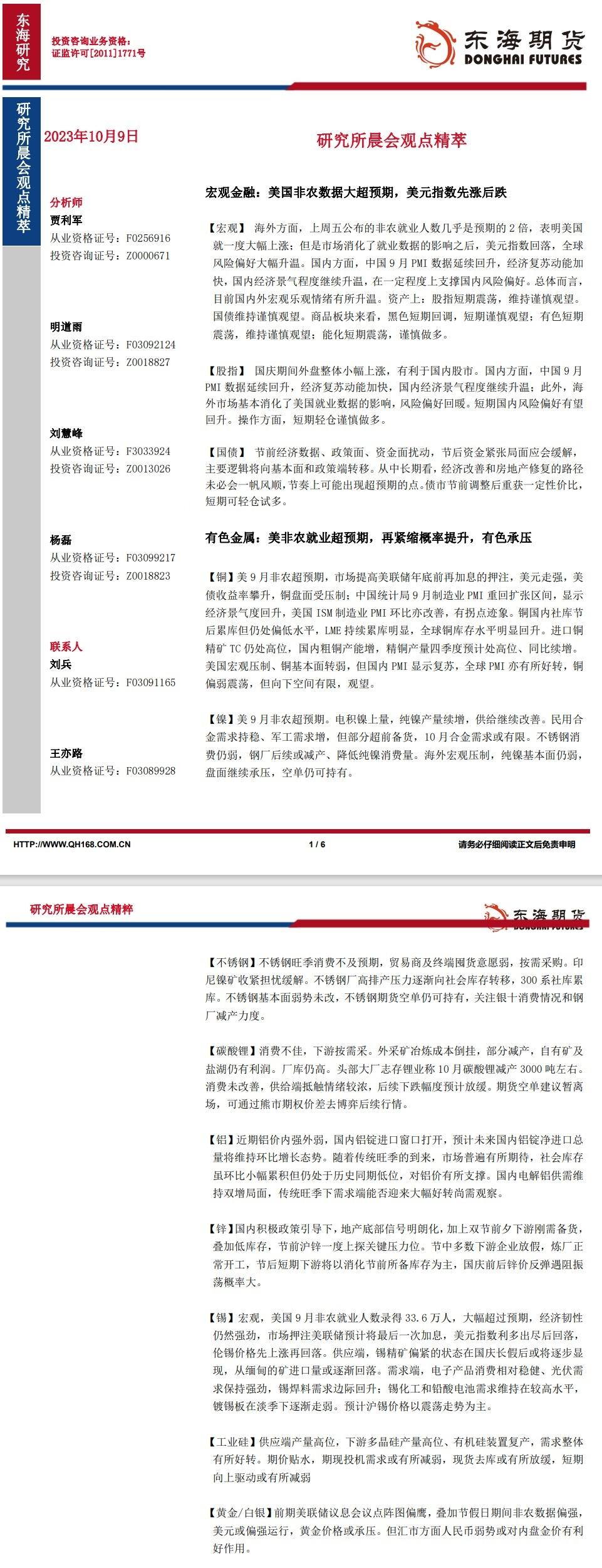 农产品: 玉米新作增产预期大概率兑现,价格重心仍有望下移。 能源化工:宏观影响需求预期,能化大幅回调。 黑色金属:需求依旧偏弱,钢材现货市场延续震荡。 有色金属:美非农就业超预期,再紧缩概率提升,有色承压。 宏观金融:美国非农数据大超预期,美元指数先涨后跌。