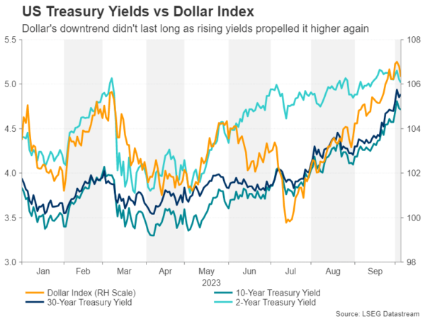 预测显示9月份的CPI月率增幅将略微放缓至0.3%,但预计年率数据将进一步上升至3.8%。 市场很可能将此解读为能源价格飙升的影响开始趋于平稳的迹象,因此除非CPI数据比预期的更火热,否则市场不太可能做出负面反应。 然而,核心CPI数据即使不是更重要,也是很重要的,因为它剔除了食品和能源价格的任何扭曲。核心CPI在过去12个月里一直在稳步下降,预计9月份将进一步放缓至4.1%,这可能会增加通胀压力正在消退的观点。 美联储会议纪要会传递鹰派的基调吗? 不过,在CPI报告公布之前,市场情绪将由生产者价格指数(PPI)以及定于周三公布的美联储9月会议纪要决定。美联储在上次会议上维持利率不变,但此后多位政策制定者一直在大力鼓吹鹰派立场,以至于美国国债收益率飙升至周期新高。#美联储政策转向#