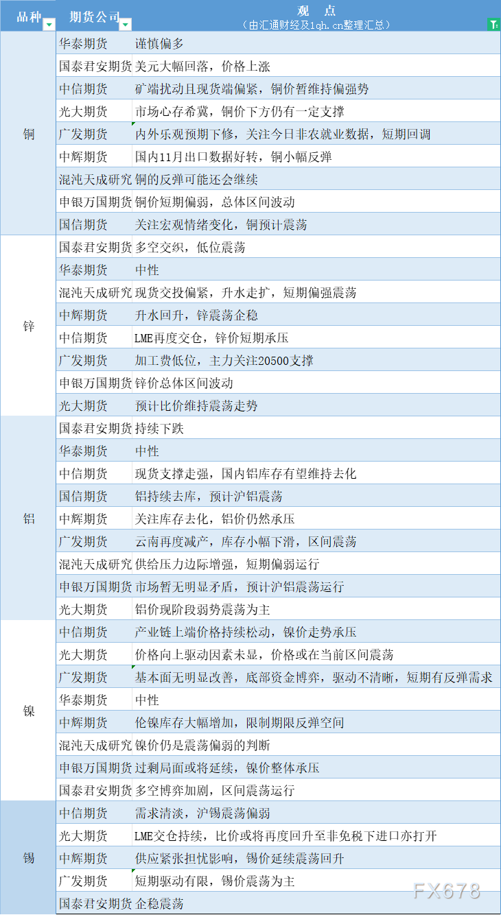 期货公司观点汇总一张图:12月8日有色系(铜、锌、铝、镍、锡等)