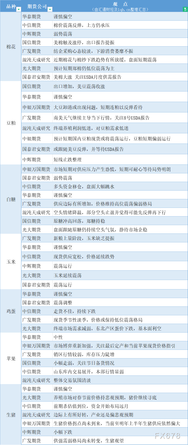 期货公司观点汇总一张图:12月8日农产品(棉花、豆粕、白糖、玉米、鸡蛋、生猪等)