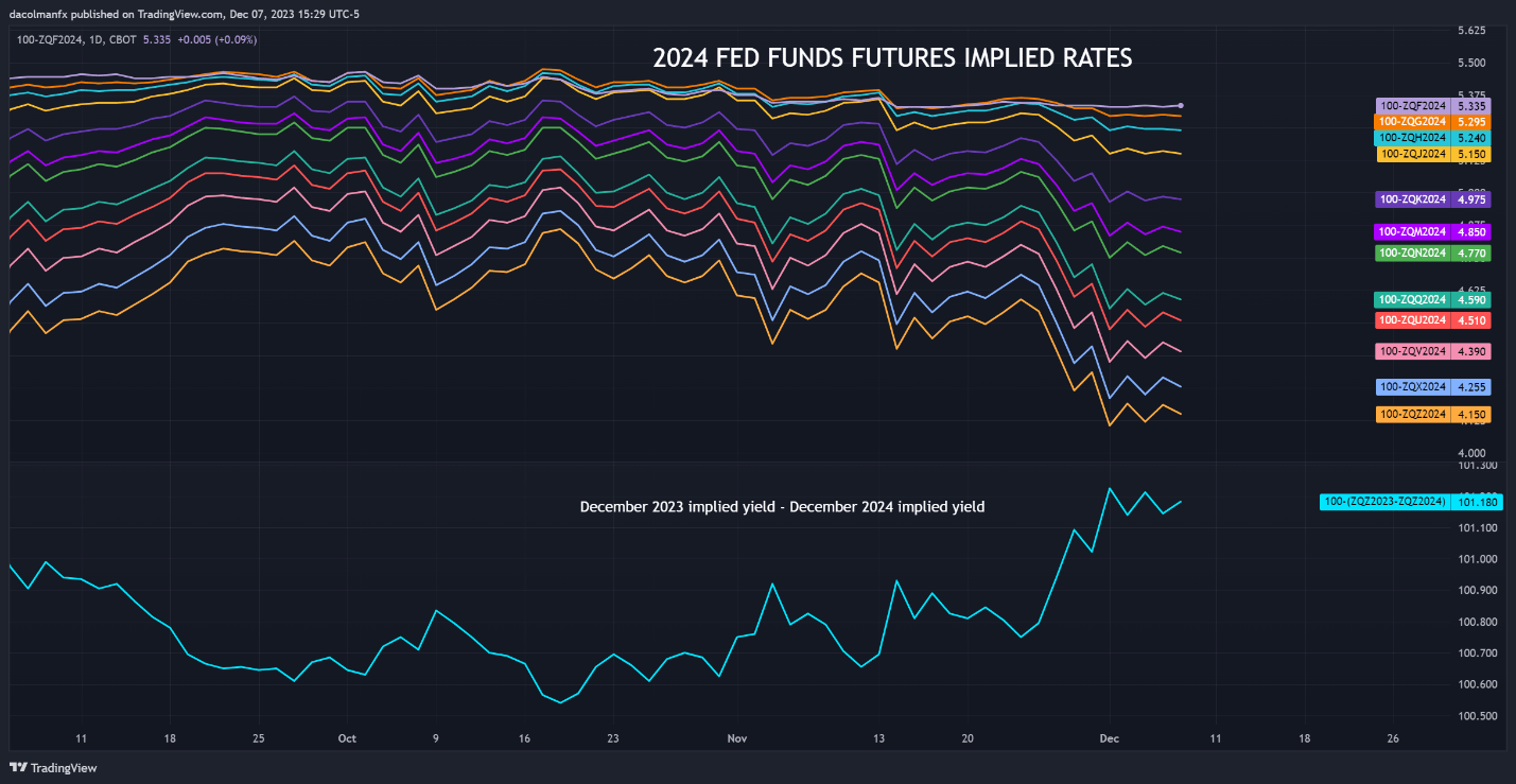 在下面的图表中,显示了所有2024年联邦基金期货合约的隐含收益率,我们可以看到,最近几周,降息押注大幅上升,交易员认为明年年底前美联储将放松100多个基点。市场可能嗅到了即将出现的麻烦,也可能完全错了。