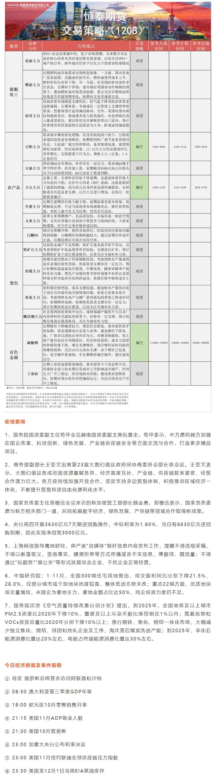 以下为恒泰期货12月8日对能源板块、黑色板块、农产品板块期货交易提醒和建议。