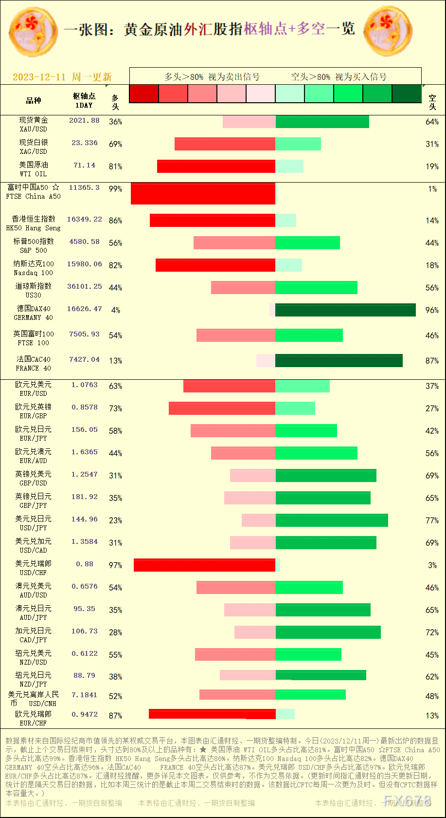 一张图:黄金原油外汇股指"枢纽点+多空占比"一览。今日(2023/12/11周一)最新出炉的数据显示,截止上个交易日结束时,头寸达到80%及以上的品种有:★ 美国原油 WTI OIL多头占比高达81%。富时中国A50 ☆FTSE China A50多头占比高达99%。香港恒生指数 HK50 Hang Seng多头占比高达86%。纳斯达克100 Nasdaq 100多头占比高达82%。德国DAX40GERMANY 40空头占比高达96%。法国CAC40FRANCE 40空头占比高达87%。美元兑瑞郎 USD/CHF多头占比高达97%。欧元兑瑞郎 EUR/CHF多头占比高达87%。汇通财经提醒,更多详见本文图表。仅供参考,不作为交易依据。
