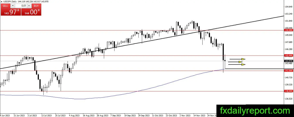 美元/日元下跌并瞬间触及200日移动平均线。目前该货币对仍处于高波动性走势,并将等待下一个走势方向的确认。盘整可能发生在142.00至145.00之间,交易者将观察该货币对在这些区域之间的反应。