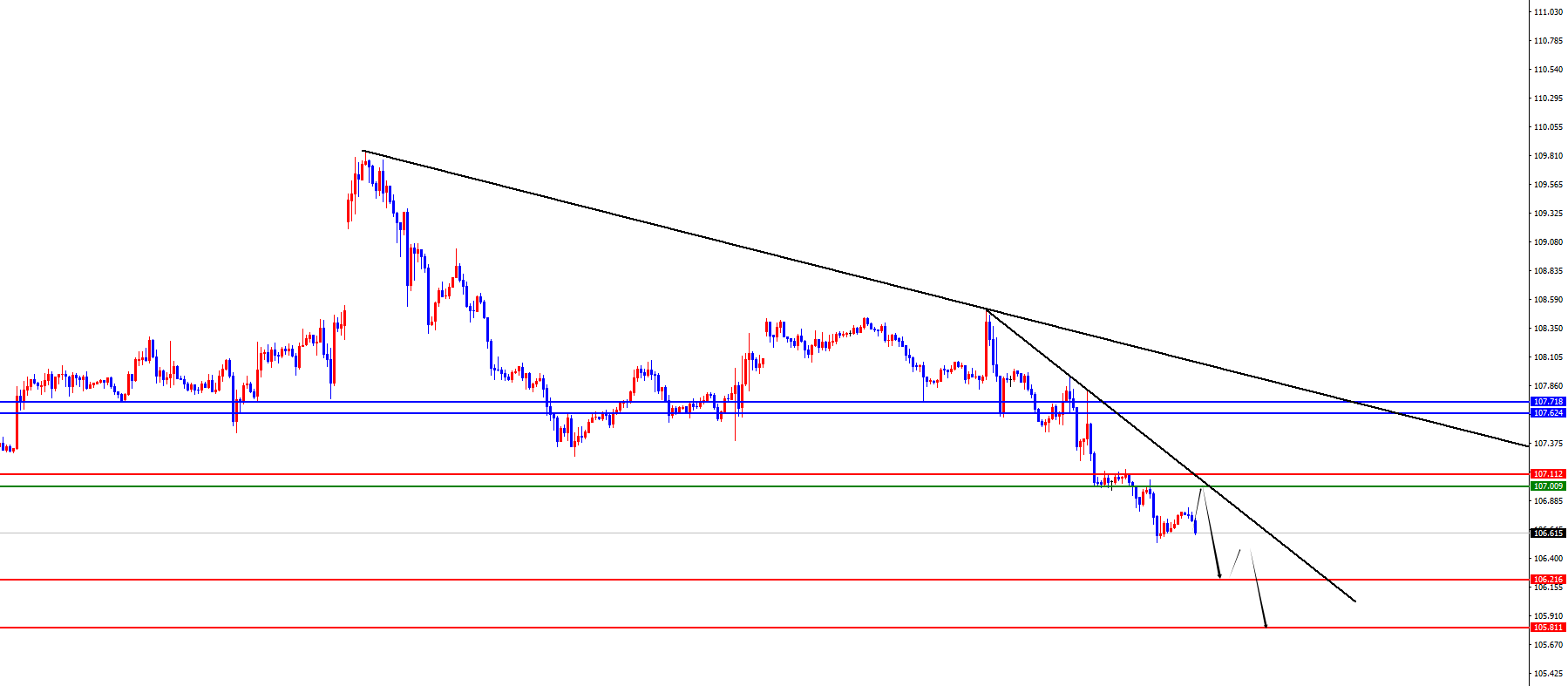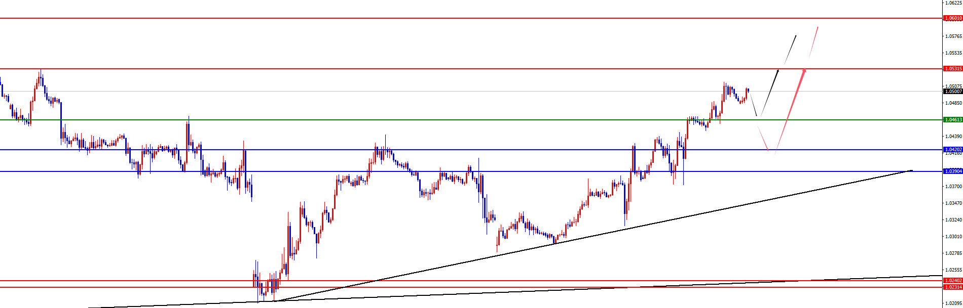 美元指数方面,上周五美元指数价格总体呈现下跌的状态。当日价格最高上涨至107.156位置,最低于106.536位置,收盘于106.79位置。回顾上周五美指价格表现,早间开盘后价格短线震荡运行,随后再度承压跌破早盘低点位置,在欧盘后二次回踩阻力位置后再度承压下跌,最终日线大阴收尾。目前看美指整体依旧呈现空头状态。从周线级别看上方阻力于107.60区域,从日线级别看上方阻力于107.70区域,所以目前无论中线还是波段均维持空,短线四小时上看暂时关注上周五高点107.00-107.10区域阻力,价格在此位置之下先偏空对待,下方关注106.20-105.80区域。