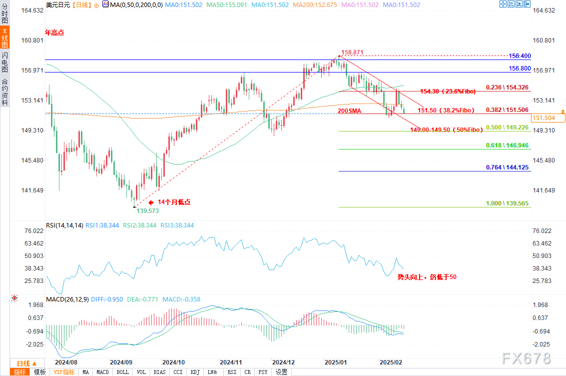 市场正试图判断美元/日元是否会继续沿长期上涨趋势运行,还是市场将最终出现重大突破并进入下行趋势。如果汇价跌破151.00,那么趋势可能会发生根本性变化。目前市场处于关键拐点,但从技术角度来看,尚未真正形成趋势反转。