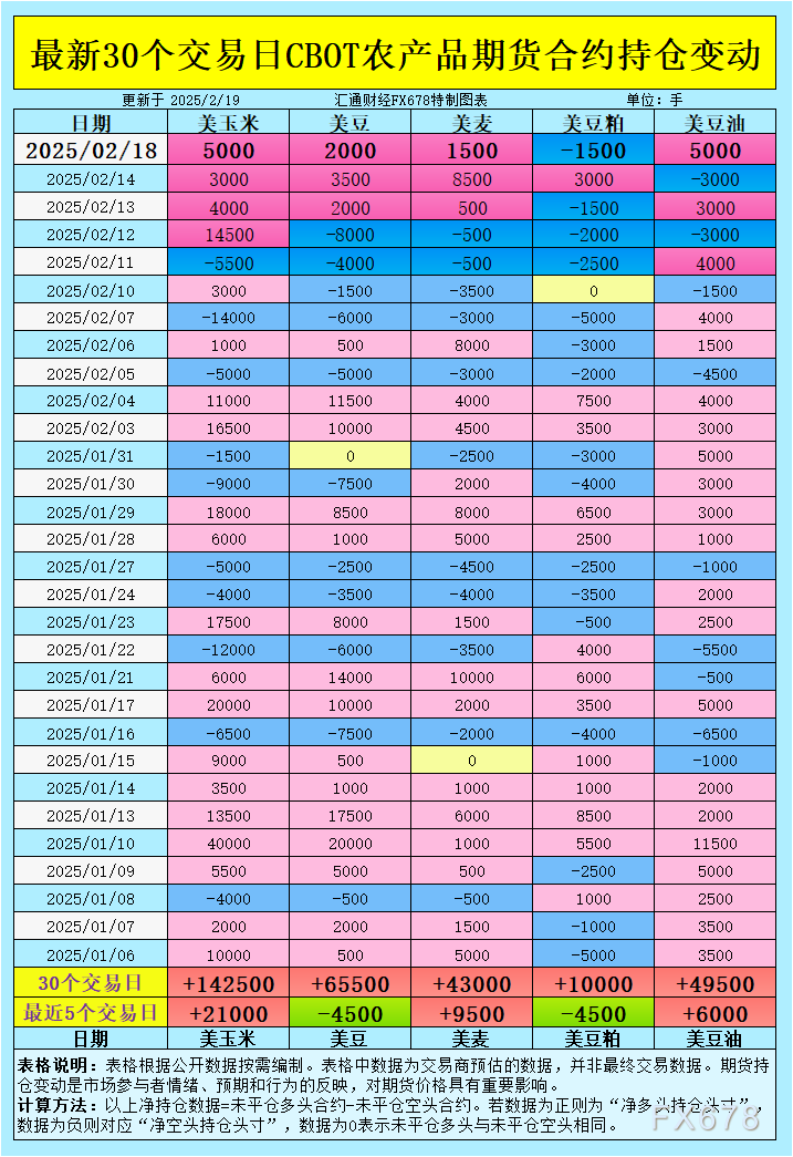 相比之下,大豆期货市场较为平稳,主要受到出口数据低于预期和南美收成压力的影响。2月13日的美国大豆出口检查量为低于预期的1,000万吨,显示出全球需求的疲软。尽管美国国内的大豆压榨量仍维持在较高水平,但南美大豆的丰收预期压制了市场情绪,尤其是巴西和阿根廷的收成状况将直接影响全球大豆供应格局。