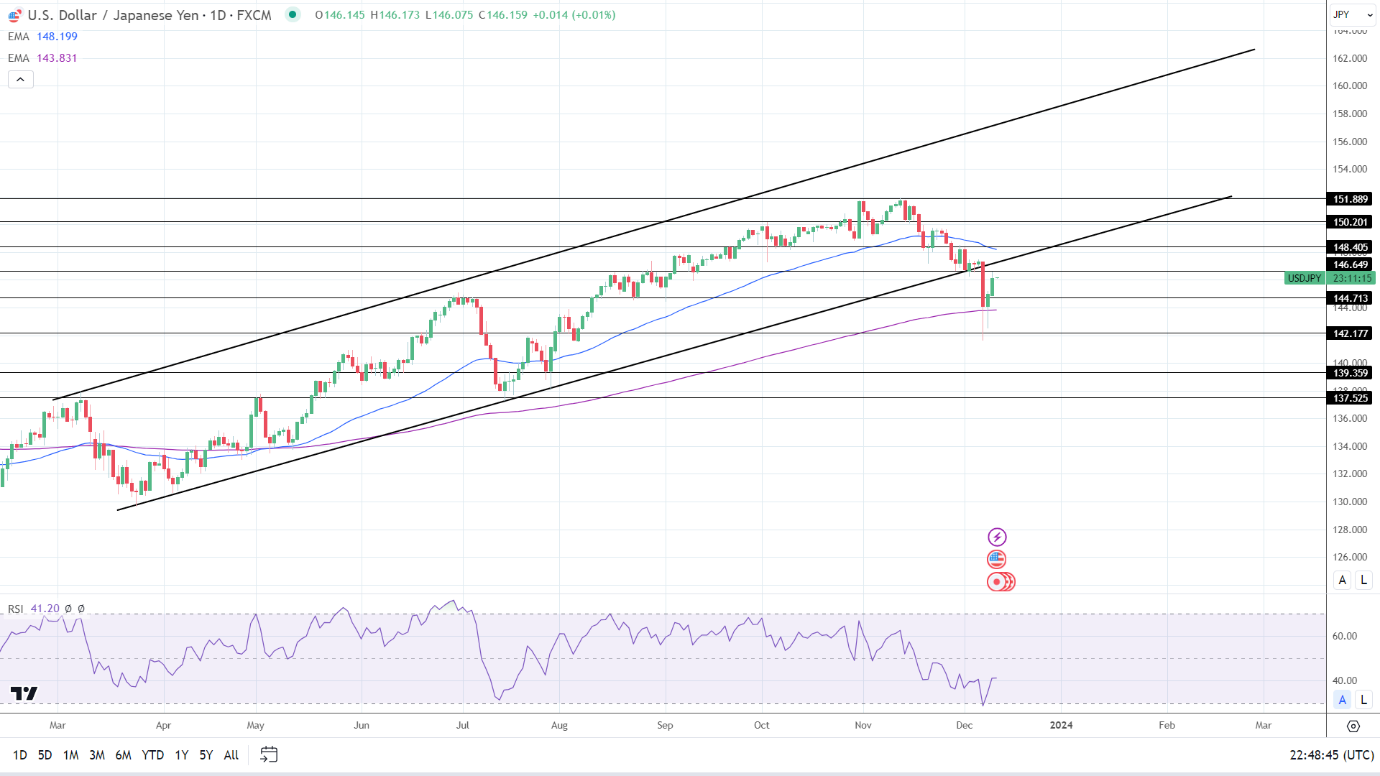 14天RSI为41.20,表明美元/日元在进入超卖区域之前先跌至144.713支撑位。