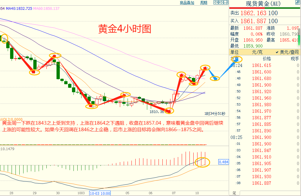 黄金周一下跌在1843.00之上受到支持,上涨在1864.00之下遇阻,意味着黄金短线下跌后有可能保持上涨的走势。如果黄金今天下跌在1846.00之上受到支持,后市上涨的目标将会指向1866.00--1875.00之间。今天黄金短线阻力在1865.00--1866.00,短线重要阻力1874.00--1875.00。今天黄金短线支持在1846.00--1847.00,短线重要支持在1835.00--1836.00。