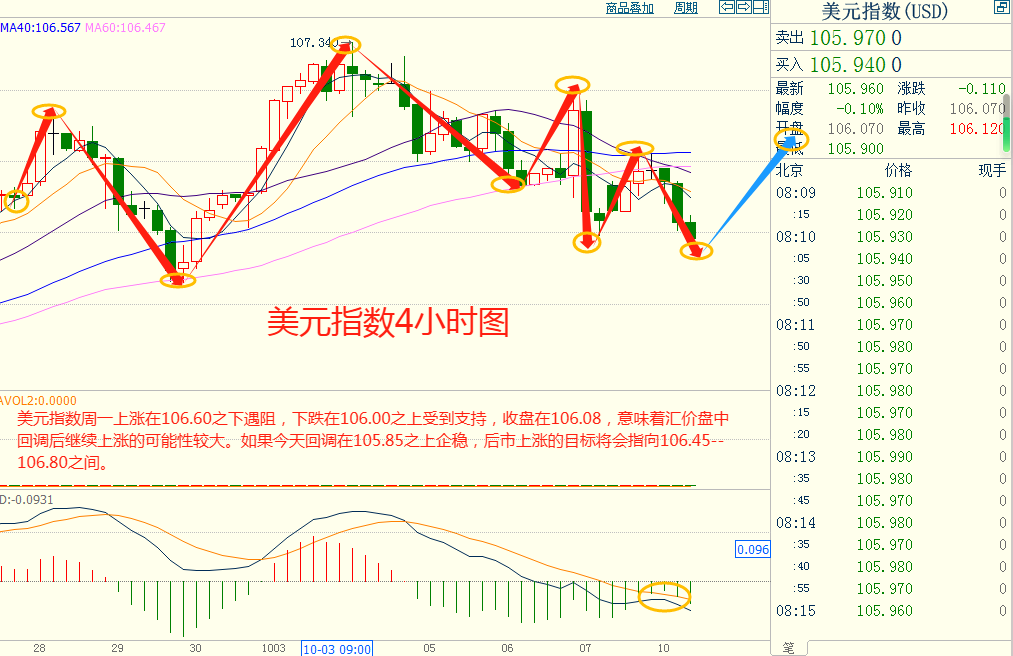 美指周一上涨在106.60之下遇阻,下跌在106.00之上受到支持,意味着美元短线下跌后有可能保持上涨的走势。如果美指今天下跌在105.85之上受到支持,后市上涨的目标将会指向106.45--106.80之间。今天美指短线阻力在106.40--106.45,短线重要阻力在106.75--106.80。今天美指短线支持在105.85--105.90,短线重要支持在105.65--105.70。