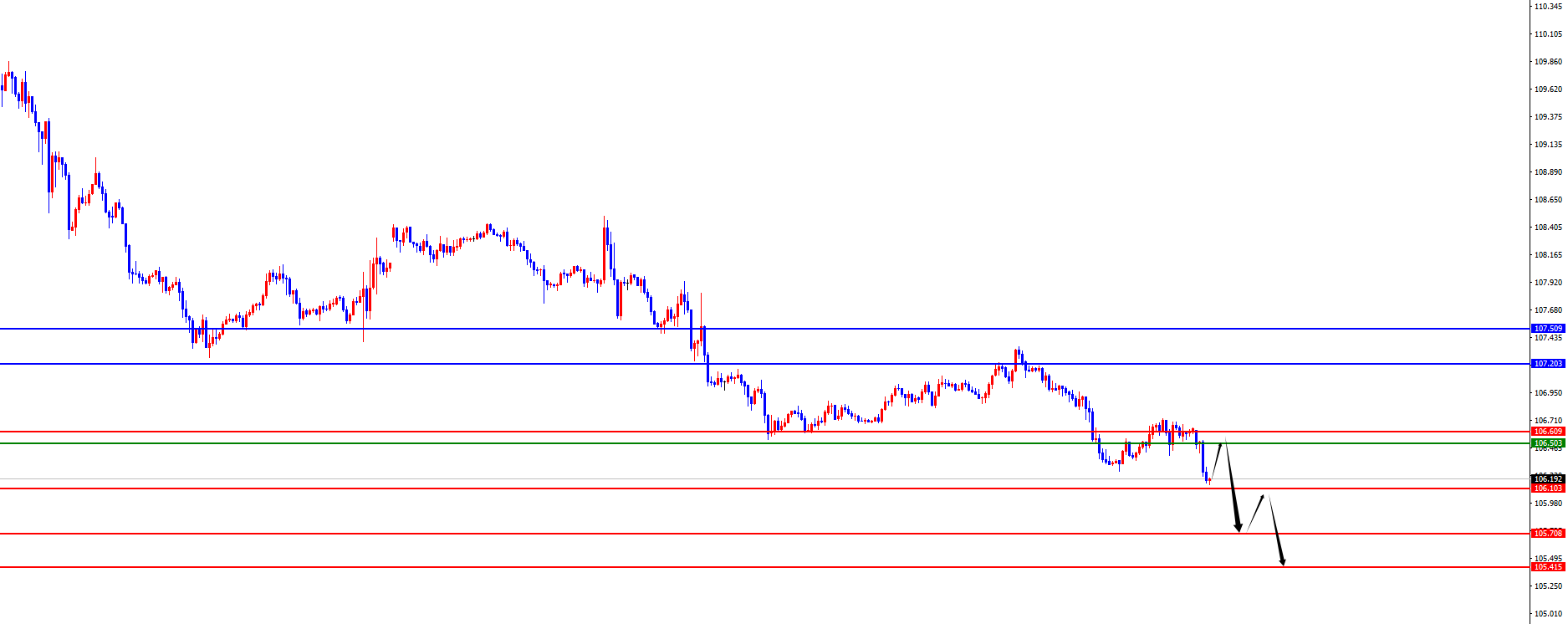 美元指数方面,上周五美元指数价格总体呈现上涨的状态。当日价格最高上涨至106.722位置,最低于106.263位置,收盘于106.632位置。回顾上周五美指价格表现,早间开盘后价格短线直接止步上行,随后价格在欧盘前触及至四小时阻力附近后止步承压,随后在欧盘及美盘震荡为主,最终日线阳线收尾。从整体看美指周线阻力于107.50区域,日线阻力于107.20区域阻力,所以整体上波段及中线依旧偏空。短线看四小时级别阻力于106.50-60区间阻力,价格在此位置之下则持续承压对待,只有上破上周五高点才会进一步回踩日线及周线阻力承压,否则继续弱势对待即可。