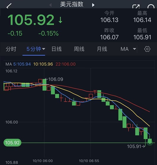 周二(10月10日)亚市早盘,美元指数小幅下探,一度跌破106,最低触及105.91,创逾一周新低。现货黄金则小幅冲高,最高触及1865.21美元/盎司。分析师指出,美联储副主席杰斐逊和达拉斯联储主席洛根周一发表鸽派言论,这打压美元走势,并令金价受到提振。