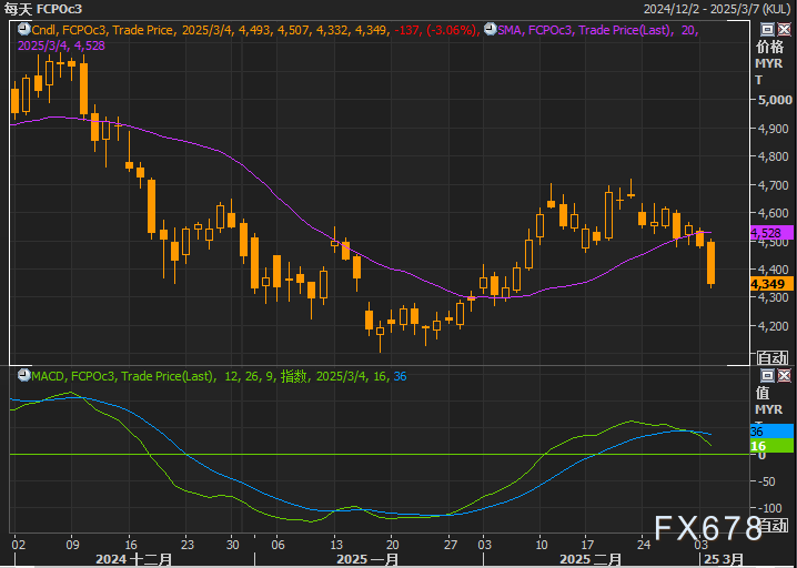 值得注意的是,油价的走势也对棕榈油产生影响。有报道称OPEC+将按计划在4月增加产量,以及美国对加拿大、墨西哥关税生效导致油价下跌。而较低的原油期货价格使得棕榈油作为生物柴油原料的吸引力下降,进一步对棕榈油价格形成打压。