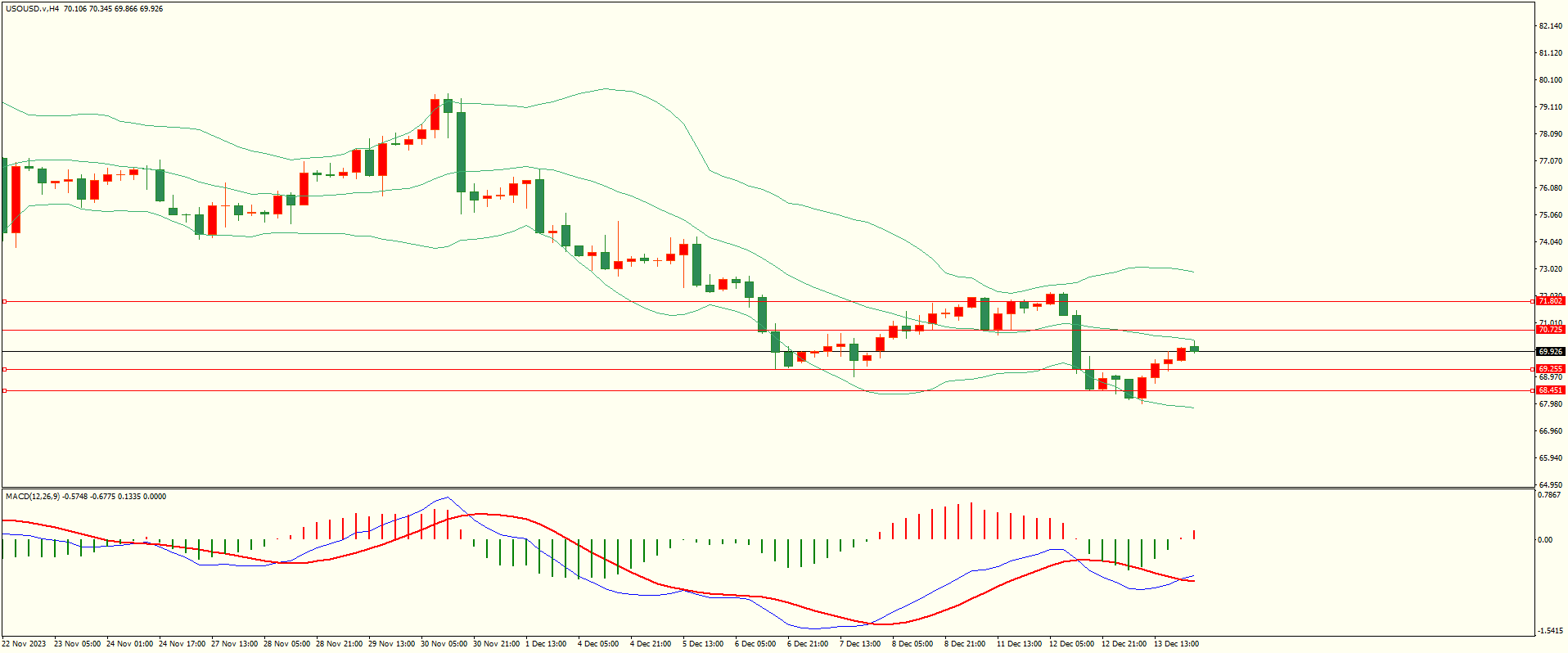 原油昨日亚市开盘后继续走低,盘中触及前支撑跌势缓和展开反弹,日线报收下影线熊阳线,支撑与阻力并存,短线的多空争夺有望继续,从4H来看,布林上下轨略有收窄,MACD零轴下方运行,日内下方首要支撑69.25,第二支撑68.45,上方阻力70.70,71.80,保持在第一支撑上方短线有望测试第一阻力。