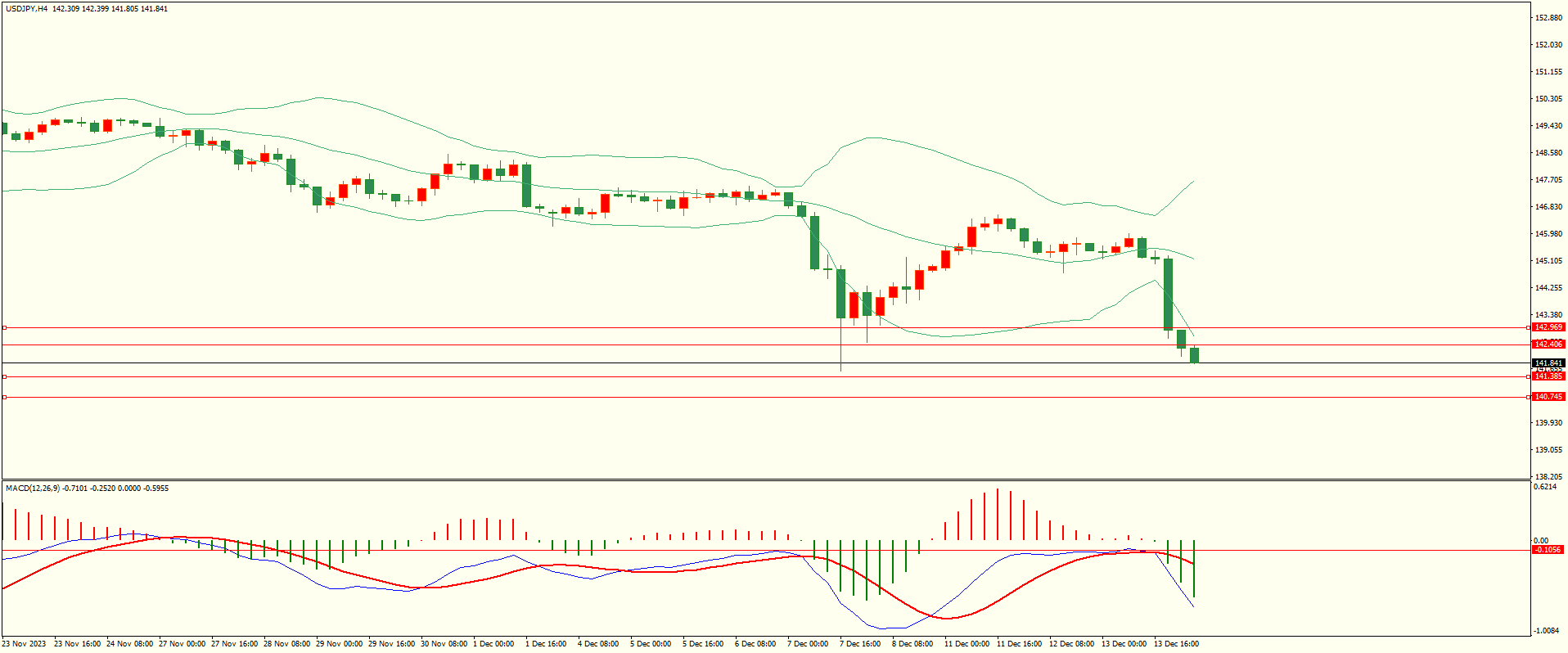 美日昨日反弹至第一阻力承压下行,纽约盘时段扩大跌幅,日线报收上下影线大阴线,空头动能增强,目前下方紧邻前低支撑,下破后方可继续,从4H来看,布林上下轨扩张,MACD零轴下方运行,日内上方首要阻力142.40,第二阻力142.95,下方支撑141.35,140.75,保持在第一阻力下方短线有望测试第一支撑。
