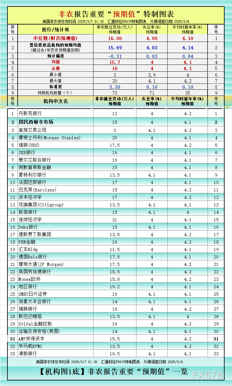 周五(2025/3/7 21:30)将发布备受关注的美国2月非农就业报告。据全球逾72个国际知名投行/金融大咖的预测结果来看,非农就业变动预期:增16万,失业率预期:4%,平均时薪年率预期:4.1%。