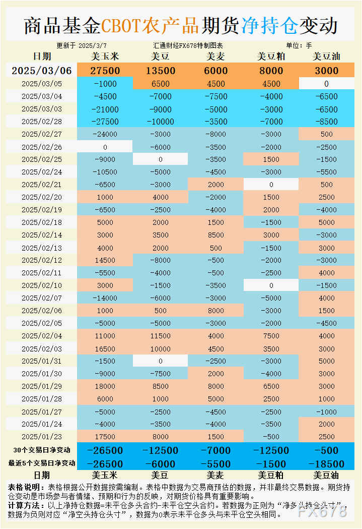 持仓数据尤为抢眼,3月6日基金增加净多头2.75万手,创近期单日最大增幅,彻底扭转了过去5个交易日净空头增加2.65万手的颓势。这一转向表明投机资金对玉米反弹的强烈看好,可能与关税缓和及出口窗口扩大有关。