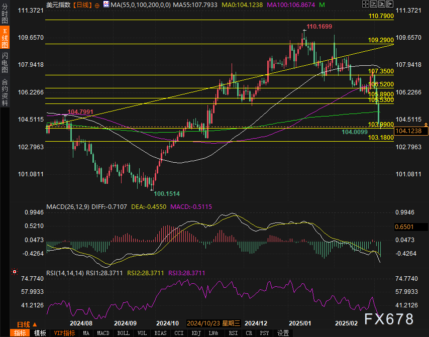 综合来看,美元近期受到多重因素打压,包括疲软的经济数据、贸易政策的不确定性以及市场对美国经济增长前景的担忧。技术面上,美元指数关键支撑位岌岌可危,反弹压力重重。投资者应密切关注未来经济数据和政策动向,谨慎应对美元可能的进一步波动。