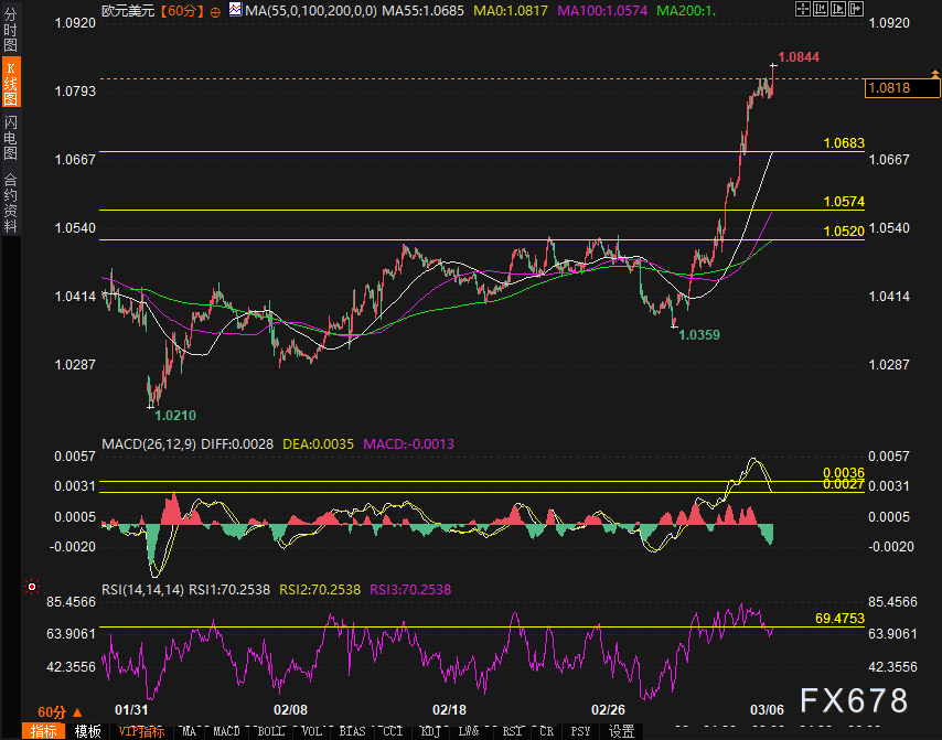 周四(3月6日),欧洲央行宣布将存款机制利率从2.75%下调至2.50%,为七次会议以来第六次降息。决议声明中“货币政策限制性显著降低”的措辞,叠加通胀中期稳定预期,推动欧元兑美元短线冲高50点至1.0844,后小幅回落。美元指数暴跌3%至104关口下方,最低触及103.8360后重回104关口。