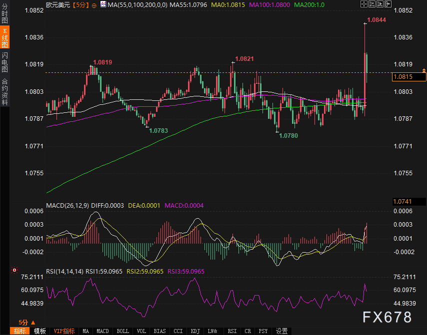 决议公布前,价格在1.0770-1.0800窄幅震荡,市场处于“等待模式”。政策落地后,价格迅速拉升约50点,突破1.0840,MA5与MA10形成金叉,MACD柱状线翻红且DIFF上穿DEA,确认短期多头动能。