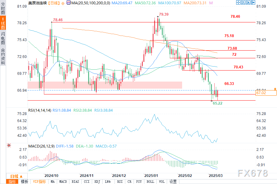 支撑位:近期明显的支撑位在65.22美元附近,价格在2025年3月曾触及该价位后有所反弹。另外,图中66.33-66.94美元区间也形成了一定支撑,价格在此附近有企稳迹象。