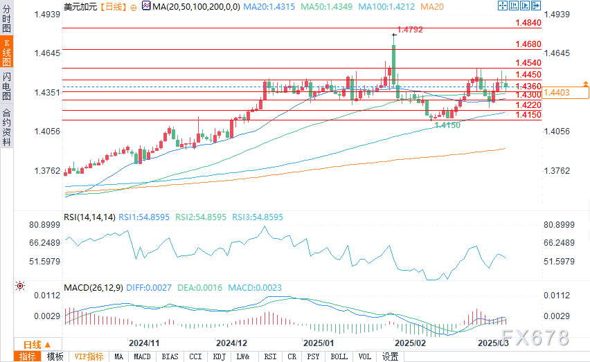 周三(3月12日)欧盘时段,美元/加元略低于1.45重要关口,盘中报1.4422/26,跌幅0.08%。在美国的关税和通胀威胁下,加拿大银行(BOC)宣布下调利率25个基点至2.75%,符合市场预期。