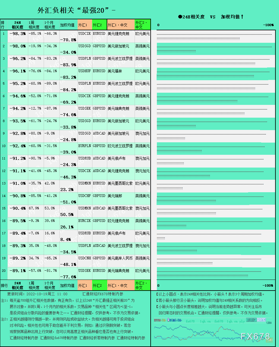 如下图2:过去24小时交易时间内,【外汇负相关】最强三个分别是:美元捷克克朗(USDCZK) VS 欧元美元(EURUSD)的外汇负相关强度达到-98.30%。美元新加坡元(USDSGD) VS 英镑美元(GBPUSD)的外汇负相关强度达到-98.00%。美元波兰兹罗提(USDPLN) VS 英镑美元(GBPUSD)的外汇负相关强度达到-96.20%。汇通财经提醒,更多参考本文如下表格。