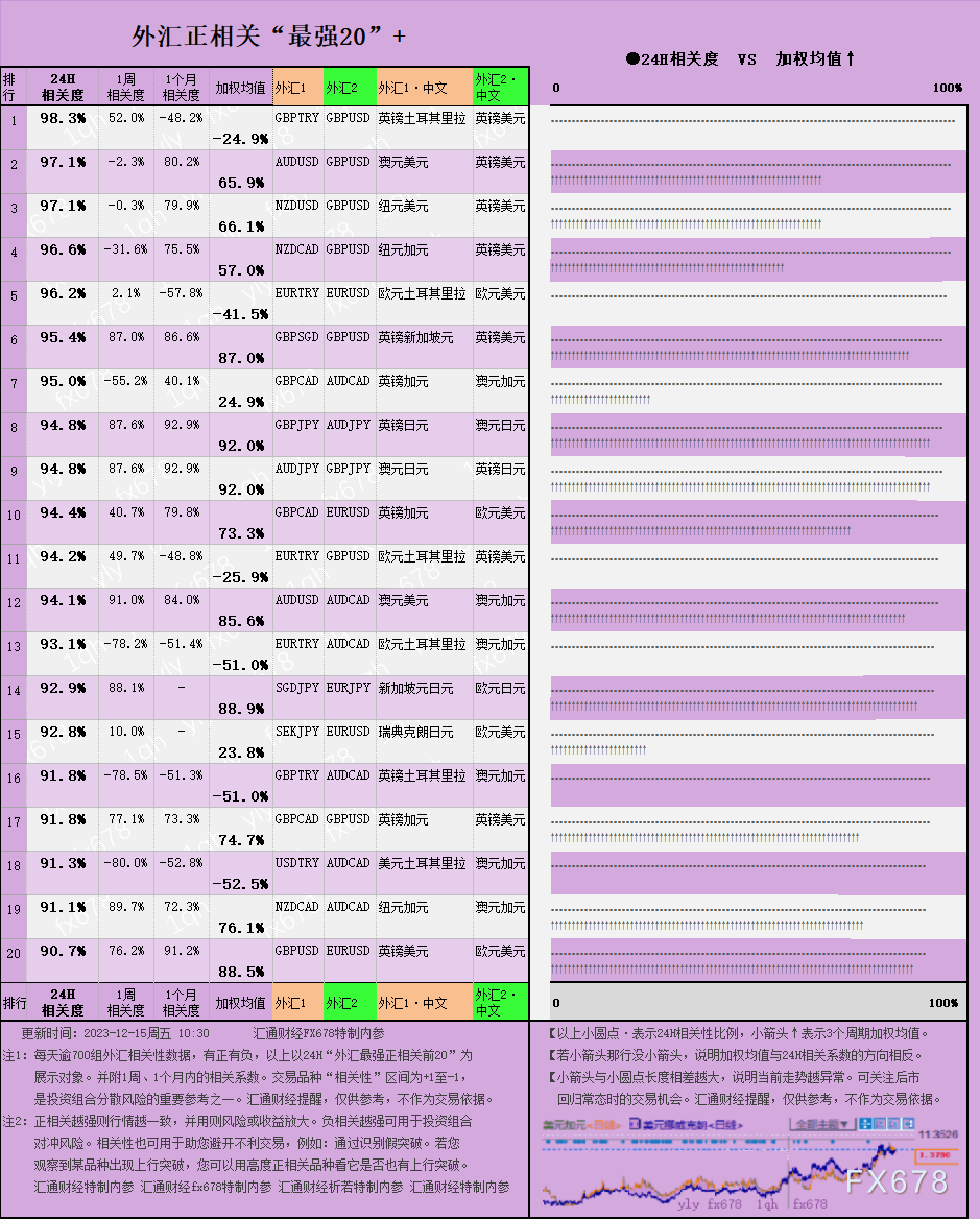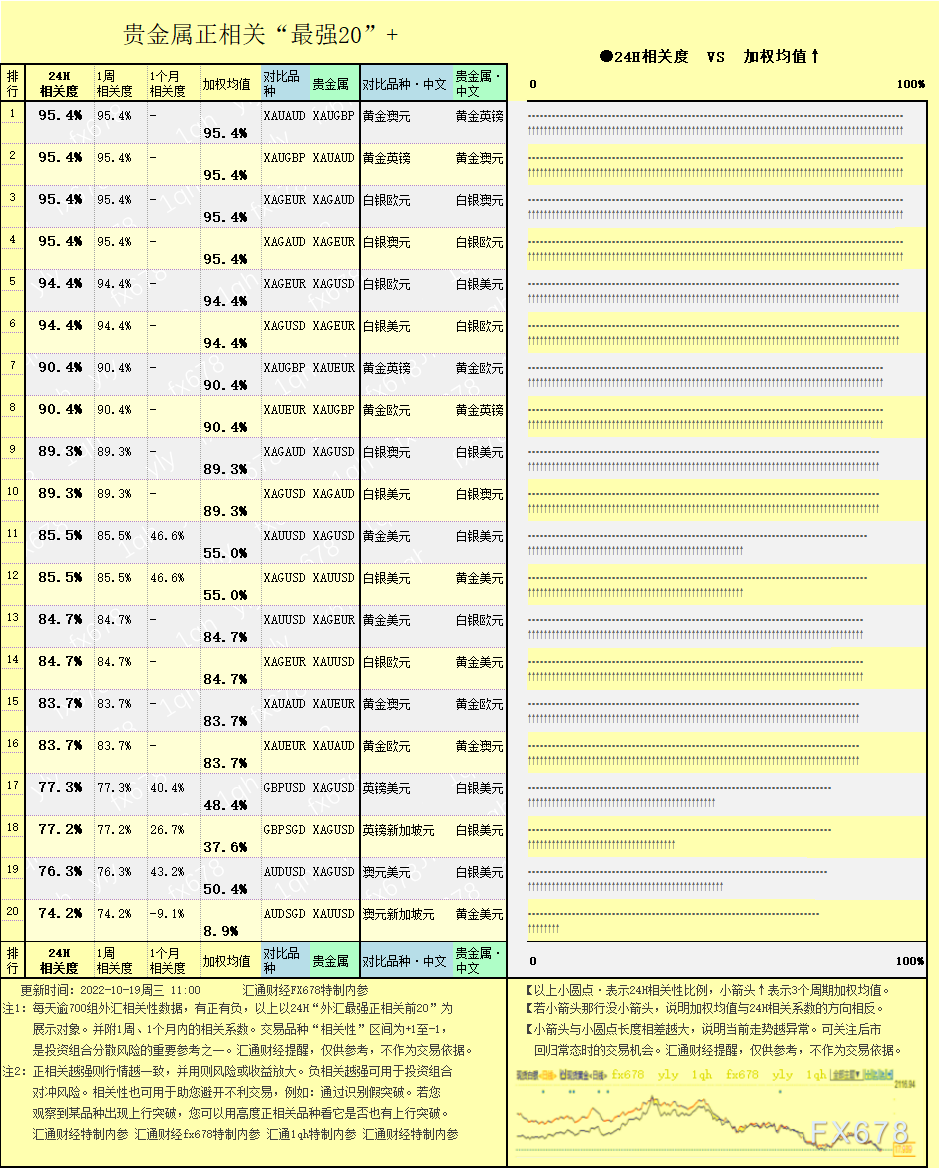 图解:外汇相关性+贵金属相关性一览(2023/12/15),分以下四张图分别做对比展现。每天逾700组外汇或贵金属相关性数据,有正有负,抽取24H“外汇最强相关性前20”为展示对象,并附1周、1个月内的相关系数。相关性也可用于助您避开不利交易,例如:通过识别假突破。又如,套期保值的用户,如果操作对象是非热门品种,没有渠道做线上操作,这种情况,可以寻找与之关联度高度匹配的热门品种进行操作。